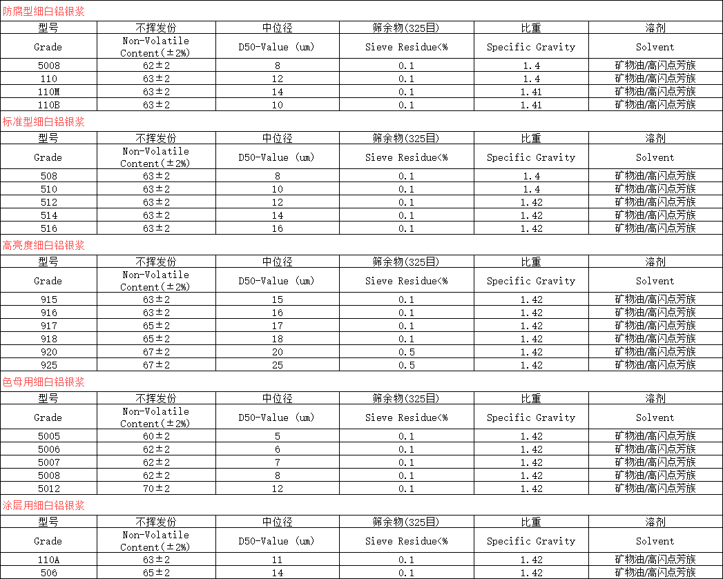細(xì)白型鋁銀漿經(jīng)特殊工藝制備,有較高的白度和非常好的遮蓋力,表面細(xì)膩平滑。根據(jù)不同的特性和要求又分為防腐型、標(biāo)準(zhǔn)型和高亮型細(xì)白鋁銀漿三種。
