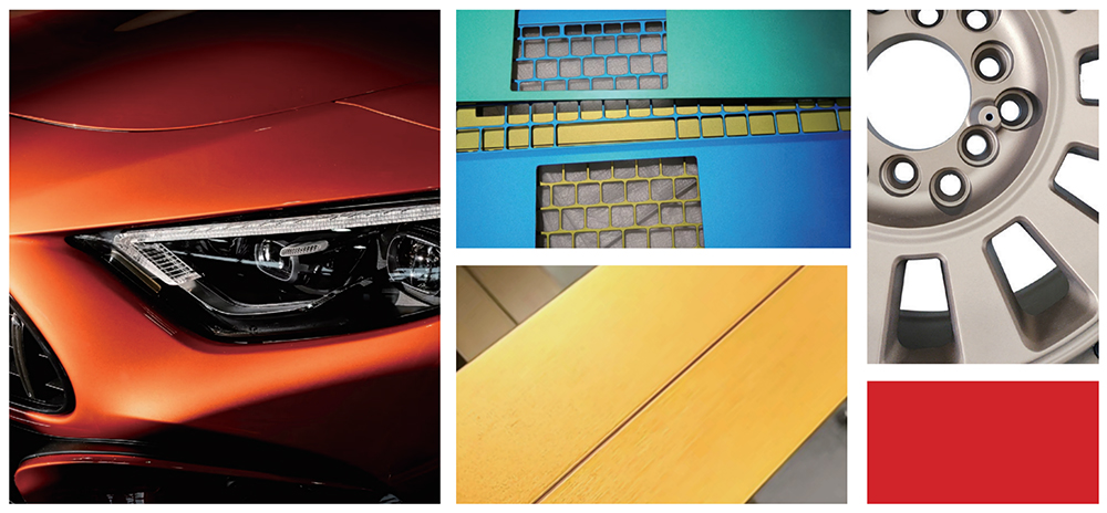 通過有機/無機包覆,在鋁片表面形成一層均勻致密的致色層,使得鋁顏料具有高金屬質(zhì)感和遮蓋效果、耐候性、耐酸堿等優(yōu)異性能,具有豐富多彩的顏色效果。有機彩鋁是有機色粉和銀漿接枝,采用高分子保護,顏色豐富穩(wěn)定,耐溫良好。無機彩鋁是水性銀漿包覆氧化鐵,類似珠光效果同時具備高金屬質(zhì)感,耐高溫,耐酸堿。廣泛應(yīng)用于粉末涂料、汽車涂料、油墨、3C、UV等行業(yè)。
